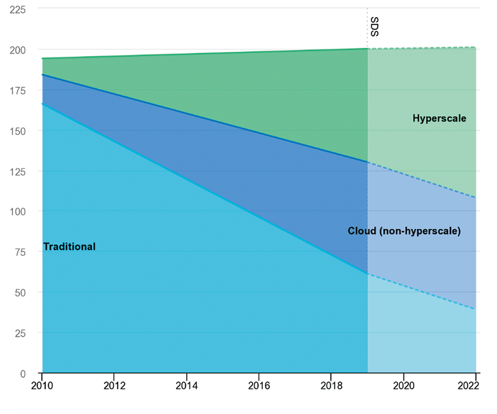 図-4は、データセンターを、Traditional(従来型コロケーション)、Cloud(non-Hyperscale)、Hyperscale(クラウド事業者向け大規模DC)の3種類に分けてそれぞの消費電力の推移を示したものです。Hyperscaleの比率は2010年と比べ、2018年には3割近く伸びており、少ない消費電力で多くの処理が可能なHyperscale DCの普及により、データセンター全体の消費電力増大が抑えられ、PUEの改善につながったことが要因の1つと考えられます。