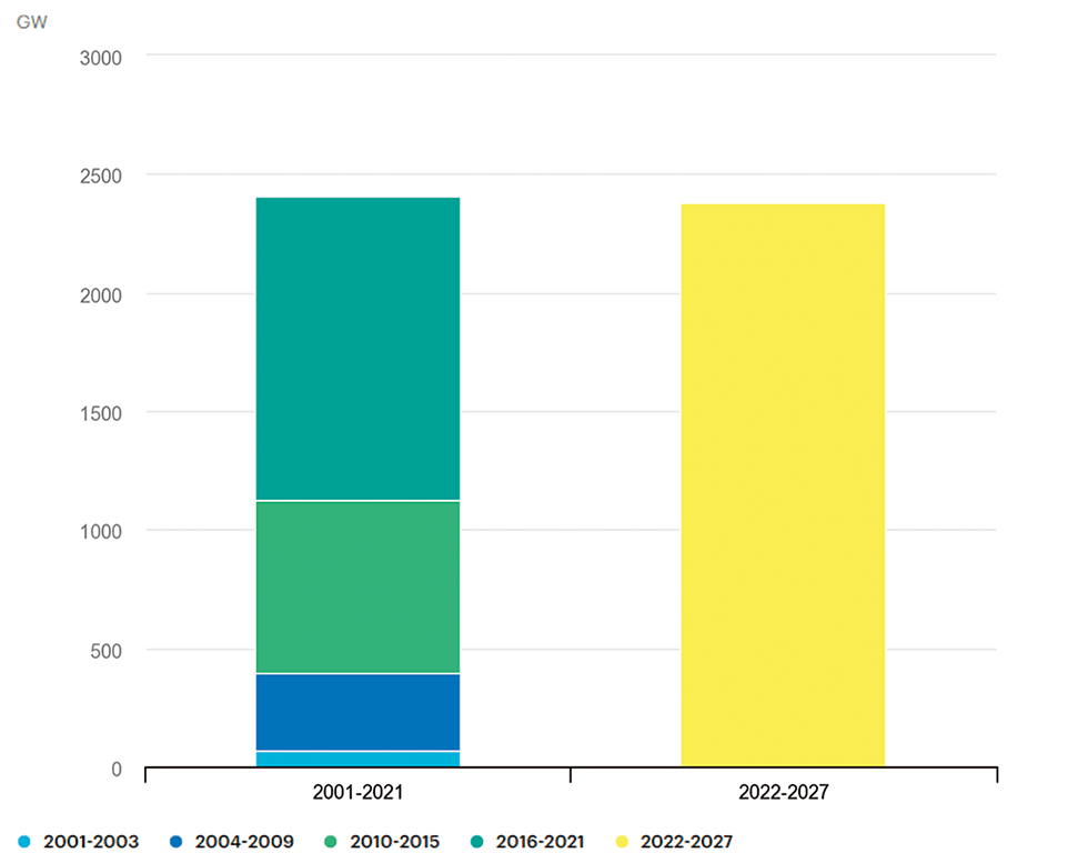 しかし、図-9のとおり2022年12月EIAは、2027年までの今後5年間に、世界の再エネ発電容量は、現在の中国の全発電量に相当する2400GW(2.4TW)増加すると報告しており、再エネの普及は世界的に加速していくと考えられます。