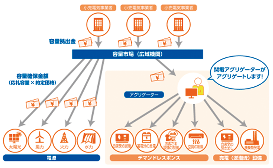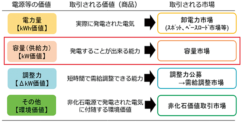 新市場の1つである容量市場は、「電力市場自由化」及び「再エネ電力導入拡大に伴い再エネ以外の電源の稼働率低下や市場価格の低下」などにより、投資回収の予見性が低下し新しい発電設備への投資が進まないリスクを低減し、将来にわたる電力の供給力を確保するために、電力量(KWh)ではなく将来の供給力(KW)を取引する市場です。