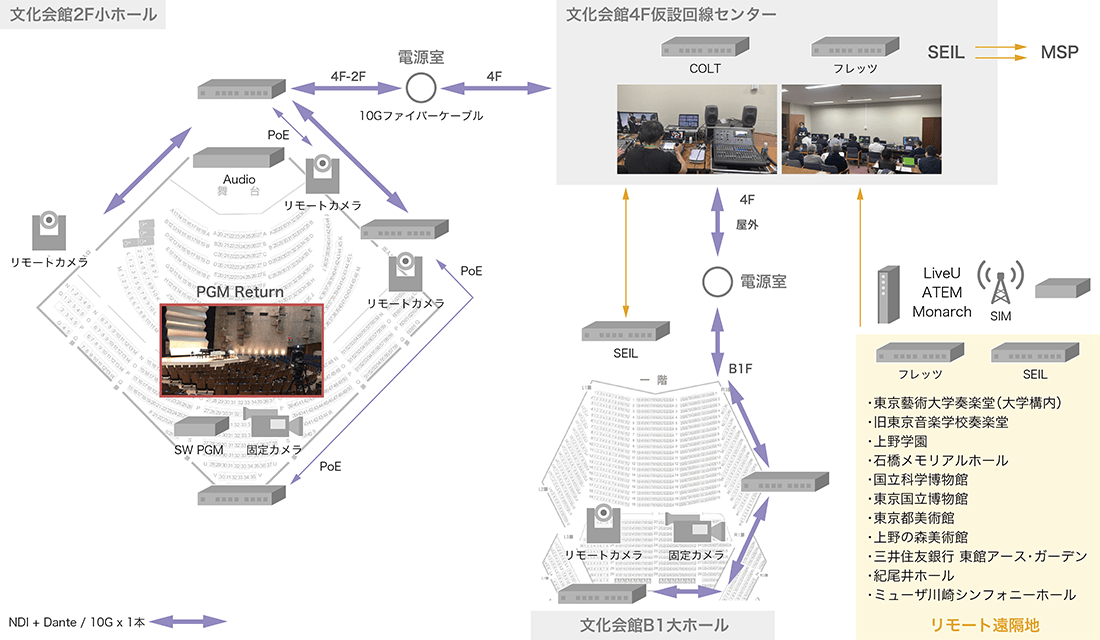 2021年の春祭では公演会場のひとつである文化会館内にNDIを利用したサブコントロールルームを仮設し、リモートプロダクション設備を構築し公演を配信しました。会場とサブコントロールルームはLANケーブルのみで接続し、リモートカメラ3式から伝送される映像・音声・タリー信号をケーブル1本で送受信可能なインフラを作り上げました。通常のベースバンドで同様に配線を行う場合はそれぞれの機器に専用のケーブルを配線する必要があるため、作業的な労力や接続ミスが発生しやすくなりますが、IPであれば配線のミスや作業負荷を容易に減らすことができます。ネットワークやカメラ機器も安定しており、NDIの画質や応答速度など含めて本番環境においても実用可能と判断、IIJ初のNDI実戦投入となりました。ただ、実際の現場では、会場を期間中全て押さえているわけではないため、電源やネットワーク線の配線と撤収を公演ごとに行わなければなりません。サーバ機器もほぼ毎日のようにシャットダウンさせる必要があり、動作確認の軽減など安定運用の観点から常設のサブコントロールルームの必要性を感じた最初の配信となりました。