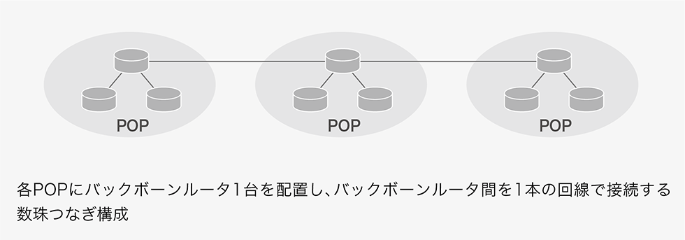 バックボーンはPOP(Point Of Presence)ごとに1台のバックボーンルータを設置し1本の専用線でPOP間を数珠つなぎに結ぶシングル構成から始まります。