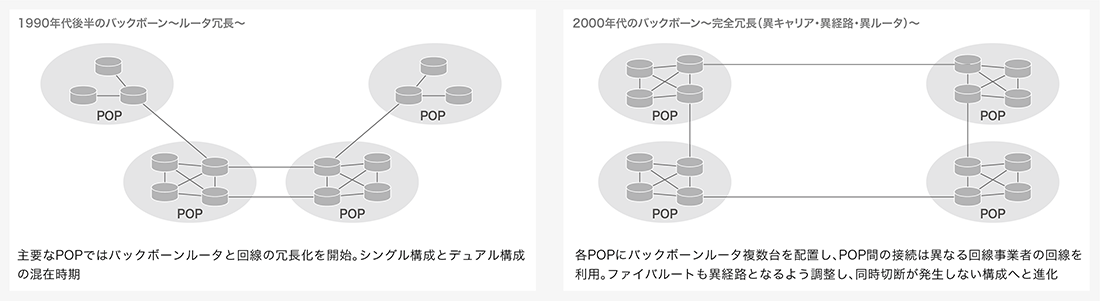 シングル構成のまま拡張を続けたIIJバックボーンですが、1999年頃からインターネット上での金融取引が始まるなど、企業でもネット活用が一般化するにつれインターネットに求められる品質がより厳しくなり始め、耐障害性向上への取り組みが本格的にスタートします。まずは主要なPOPから回線及び機器の冗長化を開始し、2002年頃には完全冗長化を終えました。
