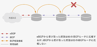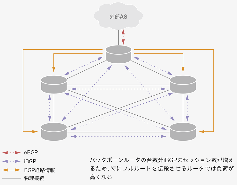 IIJバックボーンにおける経路設計はEGPによってどこにネットワークが存在するかを伝搬させ、IGPによって目的のネットワークまでの通信経路を制御するという基本方針をもとに、シンプルだが堅牢なネットワークの実現を念頭にデザインされています。当初はルータ数もインターネット上の全経路数(フルルート)も少なく、BGPも発展途上にあったことから必要最低限の機能しか実装されておらず、iBGPの構成はフルメッシュで組む形態が基本でした(図-3)。
