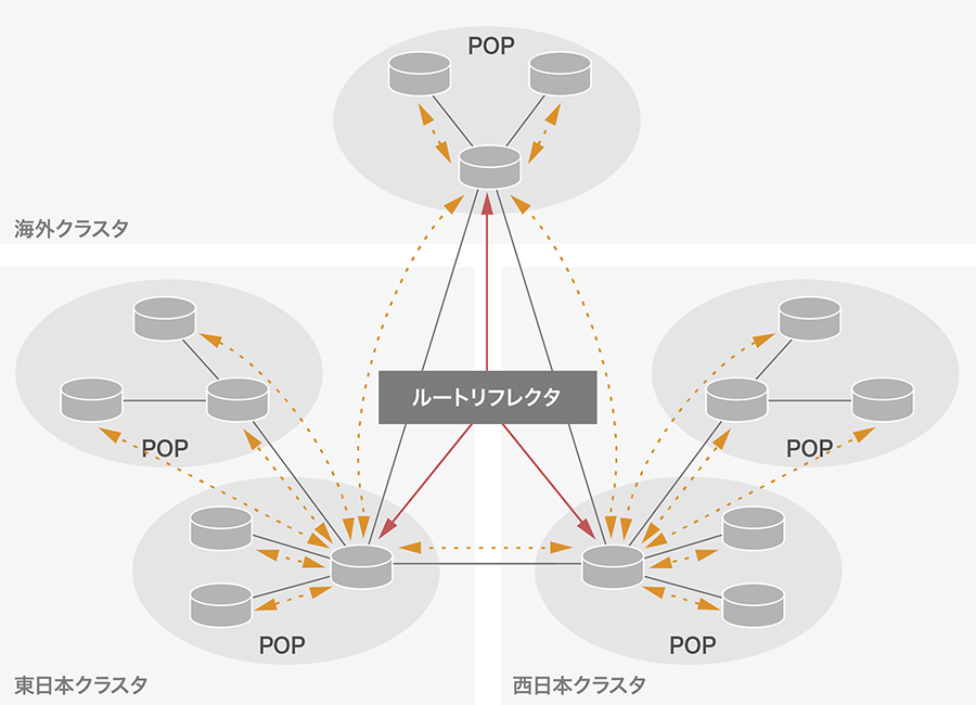 2001年頃よりブロードバンド接続が普及しトラフィック量も大幅に増えるとIIJバックボーンも更に増強・拡張が進みます。すぐに限界を迎えるのは明白だったためクラスタの細分化を行いPOPごとにクラスタを設ける構成へと移行しました(図-7)。現在もこの構成がベースとなり15年以上経過します。