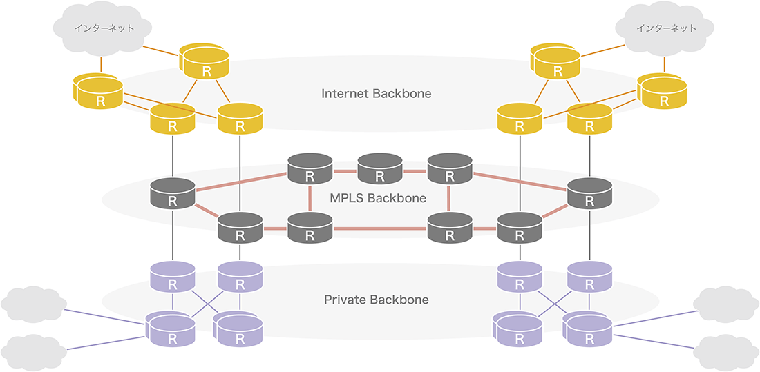 この頃になると既にAWSやGCP、Azureなど、そしてIIJでも「IIJ GIO」としてクラウドサービスを開始しており、クラウドサービスが本格化していきます。それに伴いインターネットトラフィックとは隔離された閉域の拠点間通信の需要が大きくなり、インターネットバックボーンとは別にプライベートバックボーンとしてMPLS/L3VPNを利用して拠点展開していくことになります。