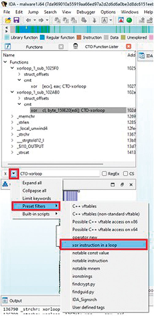 結果はOutputウィンドウにも表示されますが、CTO Function Lister上で該当関数のみにフィルタして表示することも可能です。それを行うためには図-3のとおり、再度ドロップダウンメニューを開き、"Preset filters"、"xor instruction in a loop"を選択します。