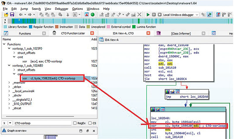これにより、図-4のようにループ内にxor命令がある構造を持つ関数のみが列挙されます。IDAはFLIRTやLumina(注3)により、静的リンクされたC言語などのライブラリ関数の名前をある程度変更してくれます。ご覧いただいて分かるとおり、それらによって最初の2つの関数以外はすべて名前が付いています。よって、優先的に見なければならないのは最初の2つの関数(sub_1025F0とsub_102AB0)です。先ほどのコマンドは該当xor命令上に"CTO-xorloop"というコメントを付与しており、それをCTO Function Lister上でフィルタして表示しています。cmtというサブツリーがそれにあたり、CTO Function Lister上の該当行をクリックすることで、IDAの逆アセンブルビュー上で該当アドレスにジャンプすることができ、周辺のコードを確認することが可能です。