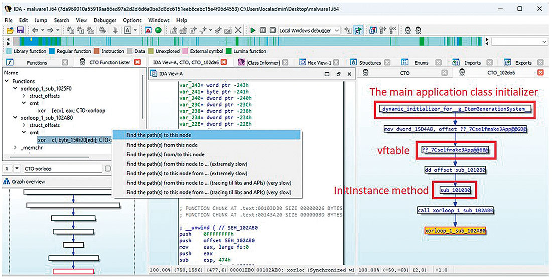 CTOは該当アドレスへの、もしくはそこからの経路を表示することができます。図-5はCTO Function Listerで発見したxor命令を右クリックして"Find the path(s) to this node"を選択した際の結果です。結果は画面右側にコールツリーグラフとして表示されます。