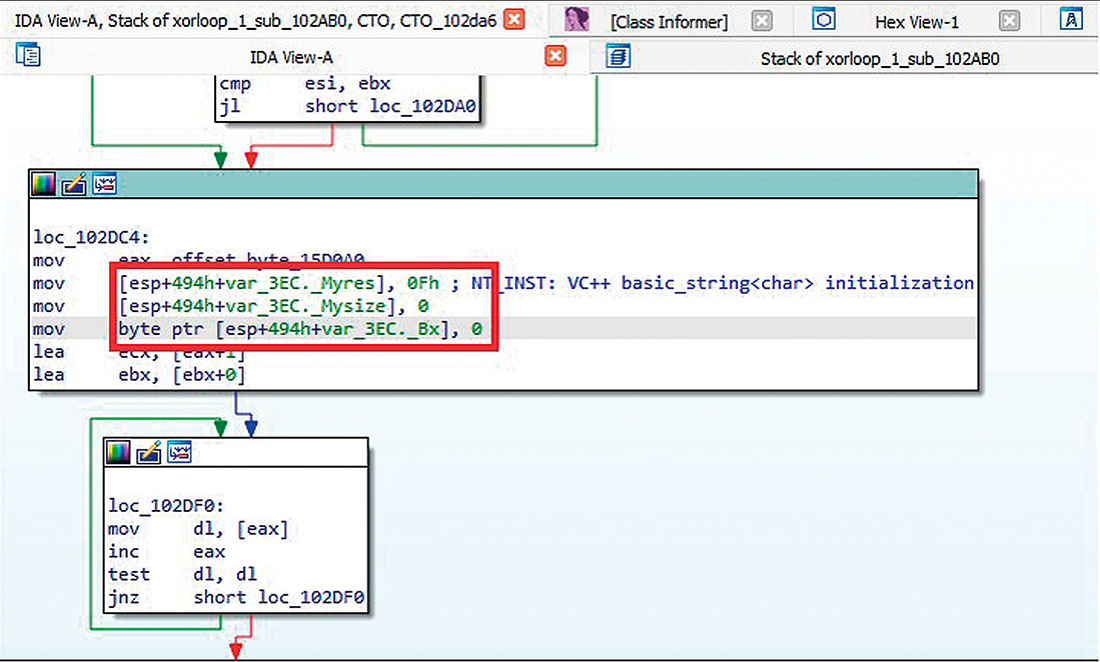 例として、マルウェアによってデコードされたコンフィグデータをパースしていくコードで使われていたstd::stringを見ていきます。図-7はCTOで検出したstd::stringの初期化部分のコードを表示したものです。図中1つ目の赤枠では、即値0xfでスタック変数が初期化されているのが分かります。これは、Visual Studioのstd::stringで長年使われている初期化コードの一部です。その2命令下(2つ目の赤枠)には、1バイト分のNULL文字でバッファの先頭部分(前述の0xfで初期化したアドレスより-0x14の位置)を初期化しているコードも見えます。これらがセットで存在した場合、筆者はstd::stringであると判断して構造体を適用するようにしています。