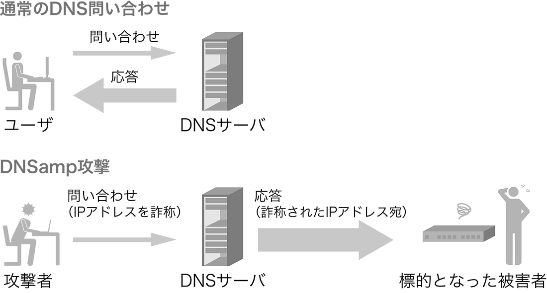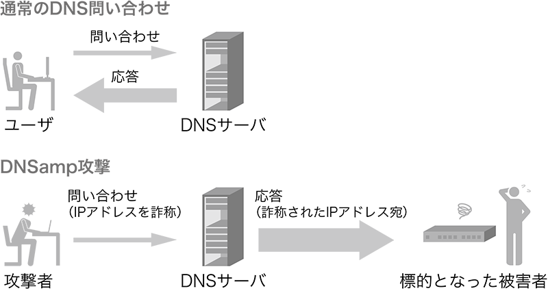 DNSは下位層のプロトコルとして主にUDPを用いますが、UDPはTCPに比べてクライアントによるIPアドレスの詐称が容易です。また、DNSの応答のパケットサイズは問い合わせの数十倍〜数百倍に大きくすることができます。これを利用すると、悪意のある攻撃者は送信元IPアドレスを攻撃対象のものに詐称した問い合わせを踏み台となるDNSサーバに送り、そのIPアドレスにパケットサイズを増幅させた応答を返させるようにすることで、攻撃対象のネットワーク帯域を飽和させることができます。このような攻撃を「DNS amplification attack(DNS amp)」あるいは「DNS reflection attack」と呼びます(図-1)。