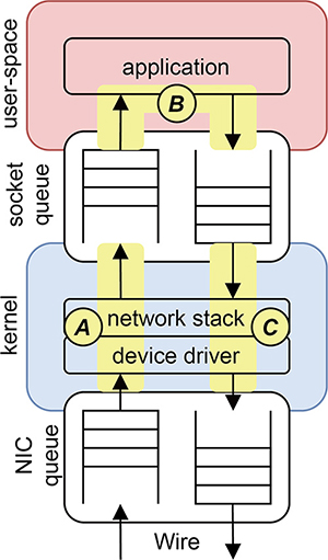 本稿では、まず2.2でシステムソフウェアにおける通信処理の挙動について触れ、次に2.3では過去の研究がそれらをどのように高速化しようと取り組んできたかについてまとめます。それらをふまえて、2.4で、IIJ技術研究所が近年行っている取り組みについて紹介します。