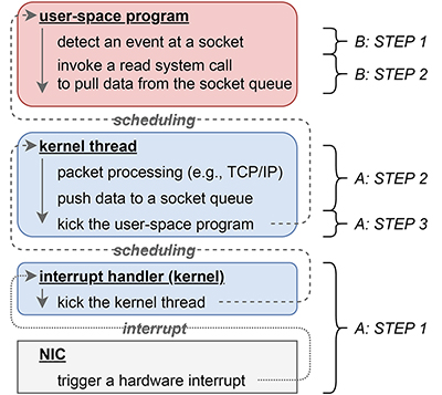 2010年代初頭より10Gbpsを超えるような速度のネットワークインタフェースカード(NIC)が一般化し、データセンターなどで広く利用されるようになりました。NICの性能向上により、それらハードウェアを制御するシステムソフトウェアと呼ばれるようなソフトウェアの、特に通信に関する処理の効率の重要性が高まり、研究コミュニティにおいては性能の改善を目指した取り組みが数多く行われてきました。