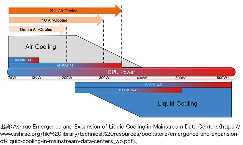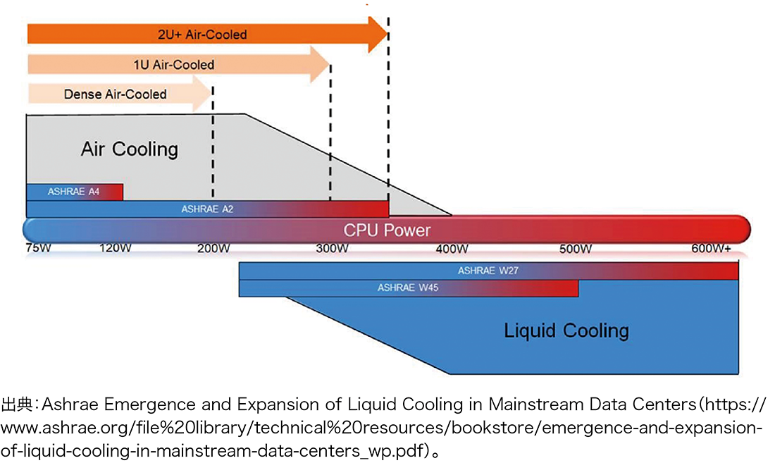 生成AI/LLMなどの技術の活用が様々な分野で進み、CPU/GPUの処理能力が増大していく中で、これらのCPU/GPUを大量に効率良く設置できることが次世代のデータセンターには求められます。今後導入されるデータセンター向けCPUは、TDP(Thermal Design Power)が300Wを超えており、AI需要への対応のため今後更に増加していくと考えられます。アメリカ暖房冷凍空調学会「ASHRAE(アシュレー)」によれば、このTDPが300Wを超えると、従来の空冷ではなく水を使った水冷の冷却方式を導入する必要があるとされています(図-6)。