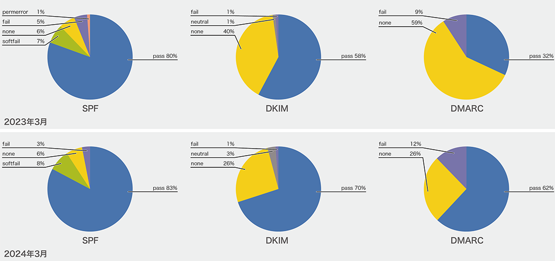 DKIM署名の割合が15%強増加し、DMARCレコードを記載した送信元ドメインの割合(DMARCパイチャートにおけるnone以外の割合)が42%から75%に30%以上増加しました。2022年には32%であったことを振り返ると、2023年はやはり、前述した事項を理由として、DMARCレコード対応をした事業者や企業が増えたと考えられます。