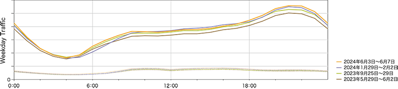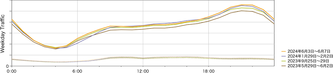 トラフィックは平日と休日で傾向が異なるため、1週間分のトラフィックを解析します。今回は、2024年6月3日〜6月9日の1週間分のデータを解析して、前回解析した2023年5月29日〜6月4日の1週間分と比較します。