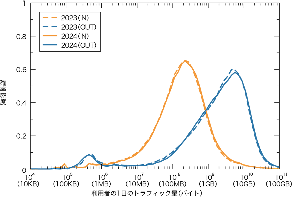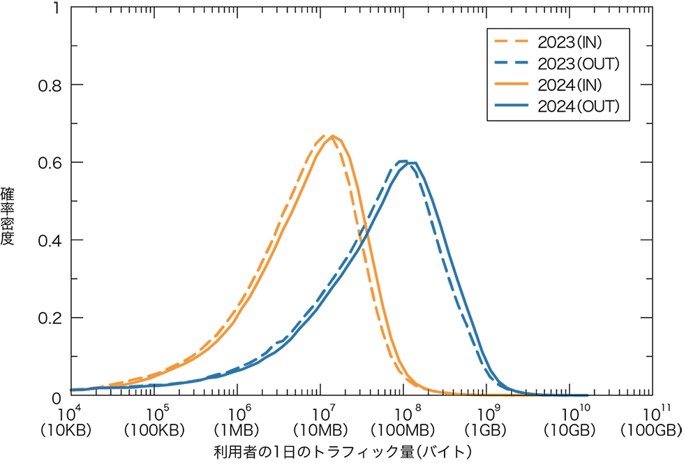 表-1は、ブロードバンド利用者の1日のトラフィック量の平均値と中間値、分布の山の頂点にある最頻出値の推移を示します。分布の山に対して頂点が少しずれている場合は、最頻出値は分布の山の中央に来るように補正しています。分布の最頻出値を2023年と2024年で比較すると、INでは224MBのまま変わらず、OUTでは5012MBから5620MBに増えています。伸び率で見ると、INで1.00倍、OUTは1.12倍となっています。一方、平均値はグラフ右側のヘビーユーザの使用量に左右されるため、2024年には、INの平均は834MB、OUTの平均は5743MBと、最頻出値より大きな値になります。2023年には、それぞれ804MBと5456MBでした。なお、前述のように2020年分まではPPPoE利用者のみの数字で、2021年以降はPPPoE利用者とIPoE利用者を統合した数字になっています。