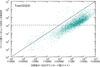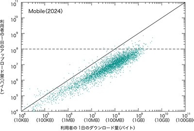 対角線の下側に沿って広がるクラスタは、ダウンロード量がひと桁多い一般的なユーザです。各利用者の使用量やIN/OUT比率にも大きなばらつきがあり、多様な利用形態が存在することがうかがえます。モバイルでも、OUTがひと桁多い傾向は同じですが、ブロードバンドに比べて利用量は大幅に少なくなっています。ブロードバンド、モバイル共に、2023年との違いはほとんどないと言えます。