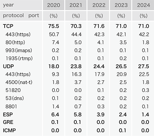 表-3はブロードバンド利用者のポート使用割合について過去5年間の推移を示します。2024年の全体トラフィックの68%はTCPで、昨年から3ポイント減りました。HTTPSのTCP443番ポートの割合は、54%で前回から3ポイント減りました。HTTPのTCP80番ポートの割合は7%でわずかながら減っています。QUICプロトコルで使われるUDP443番ポートは、21%で3ポイント増えました。