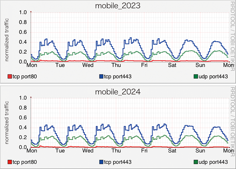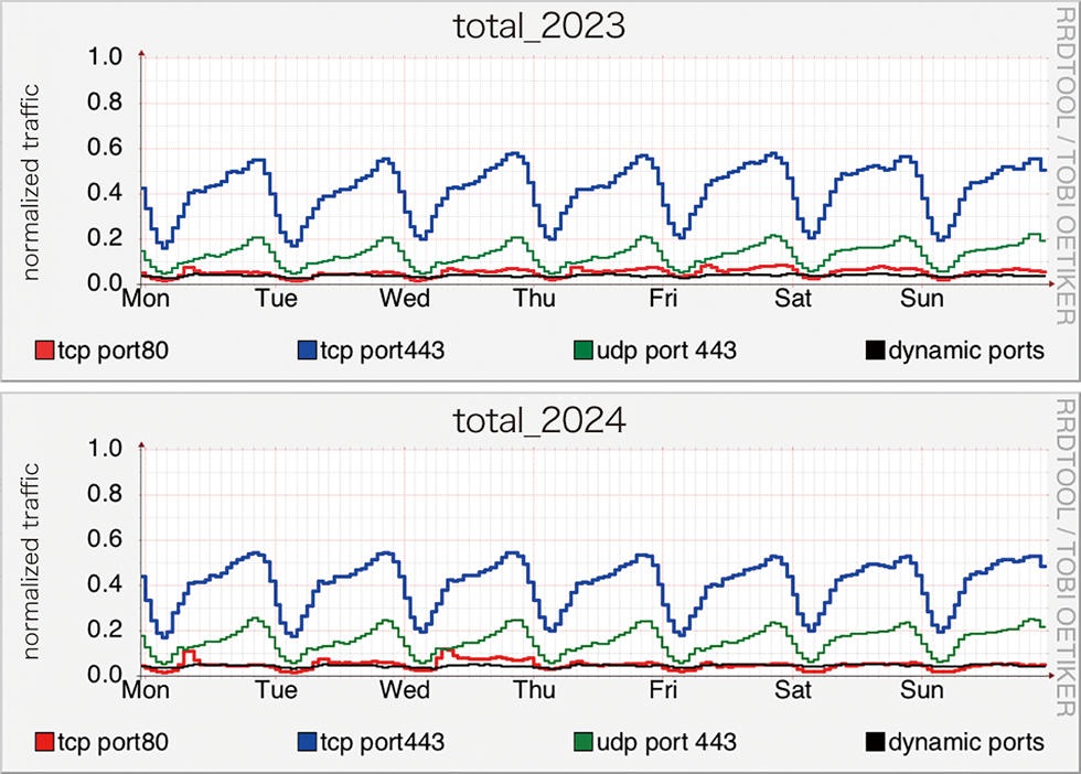 図-8のモバイルでは、トラフィックの大半を占めるTCP80番ポートと443番ポート、UDP443番ポートについて推移を示します。2023年と比べると、ブロードバンドと同様にUDPポート443番が少し増えています。ブロードバンドに比べると、平日には、朝の通勤時間、昼休み、夕方と3つのピークがあるなど利用時間の違いがあります。