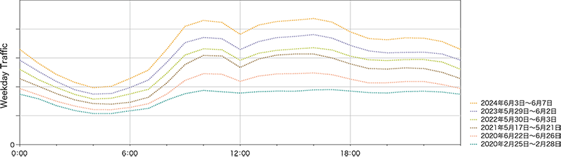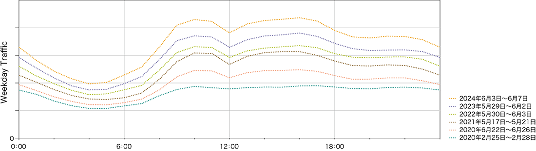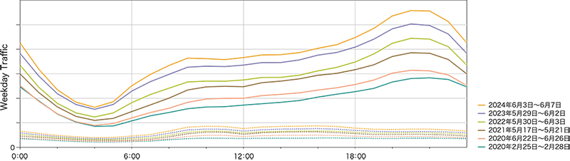 以前のコロナ禍のレポート(注3)(注4)では、感染状況に伴う在宅率の変動に応じて、トラフィック量も大きく変動していたことを報告しました。コロナ禍の最初の緊急事態宣言中には、外出制限でオンラインの活動しかできなくなり、ビデオ会議や動画視聴が急速に広まり、トラフィック量も大きく増えました。当初はインターネットのインフラを圧迫するような事態が危惧されました。しかし、長期的なトラフィック量の推移を見ると、毎年ほぼ均一に増加していて、その増加率も決して大きくはありません。その一方で、平日昼間のリモートワークや学校の長期休暇中の動画視聴と思われるトラフィックが年々増えるなど、生活に変化が起こり定着したことも見えてきます。