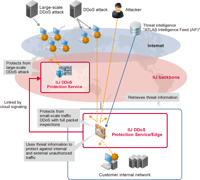 The service uses the "ATLAS Intelligence Feed (AIF)," proprietary threat intelligence provided by NETSCOUT SYSTEMS, INC., to perform DDoS attack mitigation and provide countermeasures to threats such as targeted attacks. Measures can be taken against the spread of latent internal threats, such as communication with botnets or C&C servers.