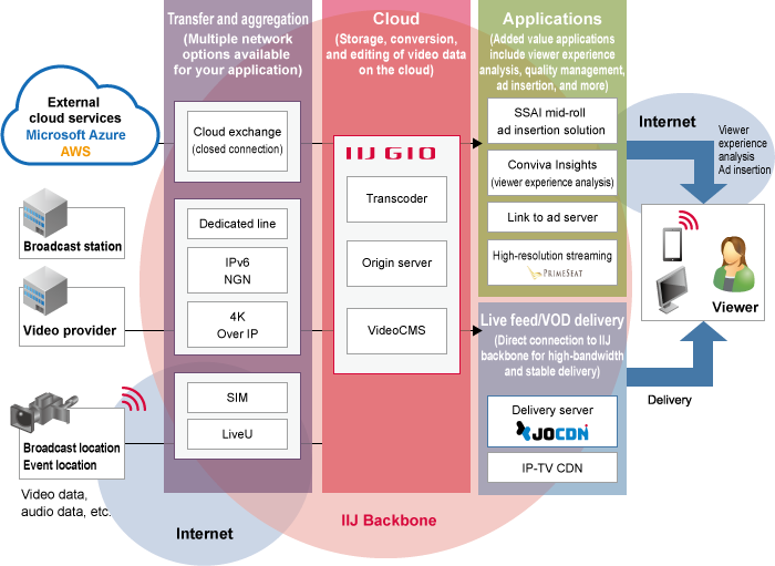 Utilizing IIJ's network experience gained from being Japan's largest backbone and ISP, the IIJ Media Communication Solution provides optimized video transfer, aggregation, and delivery.