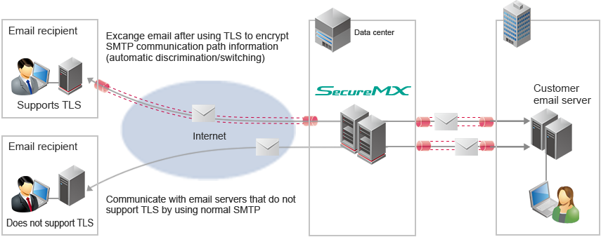 Communication path is encrypted to prevent Internet eavesdropping (viewing of data). We support TLS-based path encryption, which is becoming popular in the financial and pharmaceutical industries in the West.