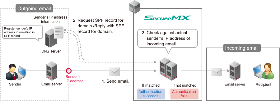 The sender's IP address of the received email is compared with the SPF record registered by the sender in advance. You check to see whether the email is sent from a legitimate email server.