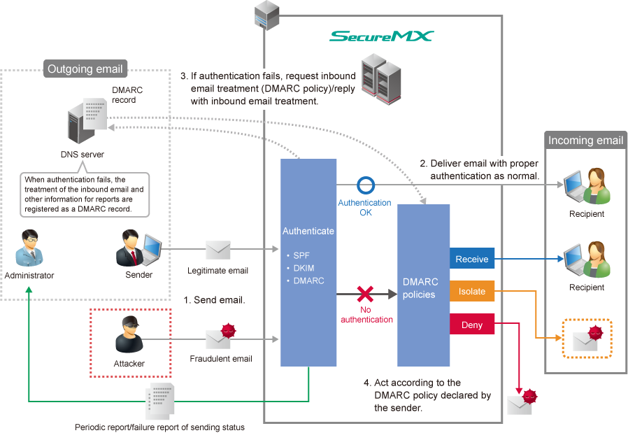 When authentication fails, actions such as quarantine/rejection are executed based on the DMARC policy predetermined by the sender. You can expect to improve the reliability of legitimate emails sent from your company domain. Also, on the receiving side, you can expect to eliminate spoofed emails that could not be determined based on SPF or DKIM authentication results alone.