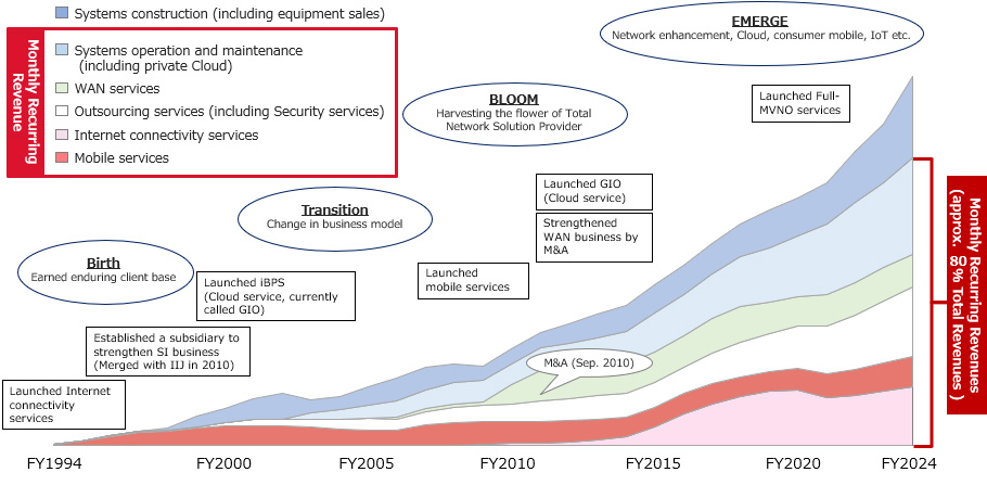 Through such business development, IIJ has built up a customer base mainly consisting of blue-chip enterprises and government agencies, and accumulated monthly recurring revenues that account for more than 80% of total revenues, thereby establishing brand recognition and IIJ Group's unique position in the enterprise ICT market. In recent years, the operation of integrated corporate networks and systems that incorporate Internet technologies has been gaining ground among Japanese enterprises and government agencies. IIJ believes that IIJ Group's role in supporting the Japanese Internet and contributing to the realization of a networked society through technology, as stated in its business philosophy, shall become increasingly important.