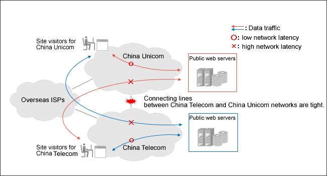 When China Telecom users connect to a public site, they are routed through China Telecom. When China Unicom users connect to a public site, they are routed through China Unicom.