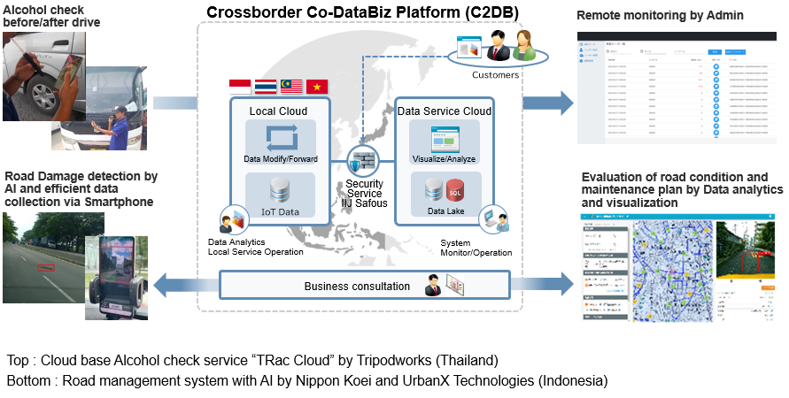 The Tripod Works TRac Cloud solution enables centralized management of alcohol checker measurements in the cloud via a smartphone app. The solution also enables ID verification by transmitting photographs along with the result. This service is being developed in response to commercial driving regulations, currently in Japan and soon to become legal requirements in Thailand. IIJ and Murata's expertise will guarantee the security of this confidential information in accordance with local laws.