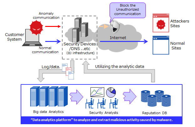 IIJ will use the data analytics platform it has created to perform multi-pronged analyses on customer logs generated through our services, and use those to analyze and extract malicious activity like that caused by malware. IIJ will take appropriate preventive and responsive action against threats to customer security based on these analyses.