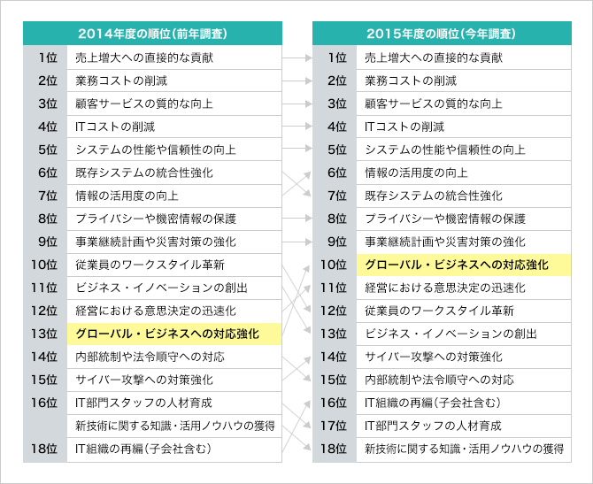 2015年の企業向け調査では、グローバルビジネスの対応強化が急激に順位が上昇しています。