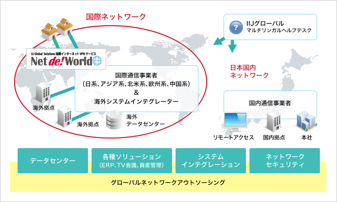 IIJは、グローバルでのネットワーク利用ニーズのすべてにワンストップで応えていく企業グループとして、インターネット接続サービスからアウトソーシングサービス、システムインテグレーションに至るまで、高い信頼性と付加価値の高いソリューションサービスを提供しています。国際通信事業者の選定・契約から導入そして運用をワンストップで提供いたします。