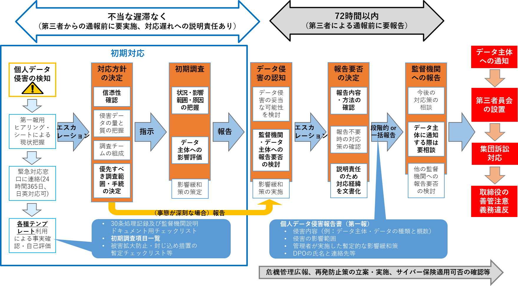 具体的に、個人データ侵害時の対応フローはどのようなものか、以下の全体像をご参照下さい: