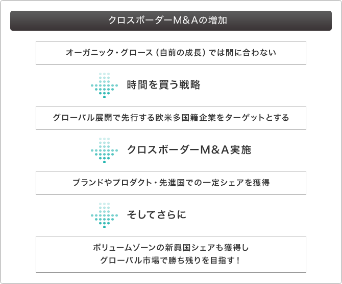 そうした意味で、市場に製品やサービスを投入した初期段階(イノベーターからアーリーアダプターフェーズ)で製品の認知スピードを上げるため、時聞を買う戦略として「クロスボーダーM&A」が注目されています。新たなグローバル化のフェーズでは、かつて日本の自動車メーカーがとったような、自前の成長(M&Aによる成長との対比で、しばしば「オーガニック・グロース」と呼ばれる)戦略では時聞がかかりすぎ、他社に先駆けてクリティカルマスを獲得するには限界があるからです。