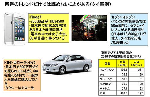 しかし、この消費トレンドに学ぶだけでは成り立たないケースがあります。これは破壊的イノベーションで創造されるような製品やシステムが該当します。例えば、新興国では固定電話網が整備される前に市場を席巻した携帯電話や、バンコク市内における日本とほぼ同等の立地件数率を誇るコンビニエンス・ストアです。また、リバース・イノベーションのような新興国向けに商品・サービス開発が新たな価値を創出し、先進国へ逆輸入されるようなケースも多数存在します。中国のHuawei社が積極的に開発している太陽電池、ディーゼル、風力等を活用し、電力が脆弱な場所においてもバックアップ電源が作動するハイブリッド型の携帯電話基地局は、現在、アフリカ向けから逆輸入して、先進国に設置が開始されています。このような事例は、これまでのトレンドから読みにくいケースです。また、所得が日本人の1/3から1/10といわれるASEANの各地域で、日本とほぼ同等の値段のiPhoneが爆発的にヒットしていること、世界中でほぼ同価格のスターバックス・コーヒーもASEANに進出を加速し、ASEANのおしゃれな若者の人気店となっています。このように所得のトレンドだけでは読めないことも多数存在することをふまえたマーケティング活動が必要なことはいうまでもありません(図2)。