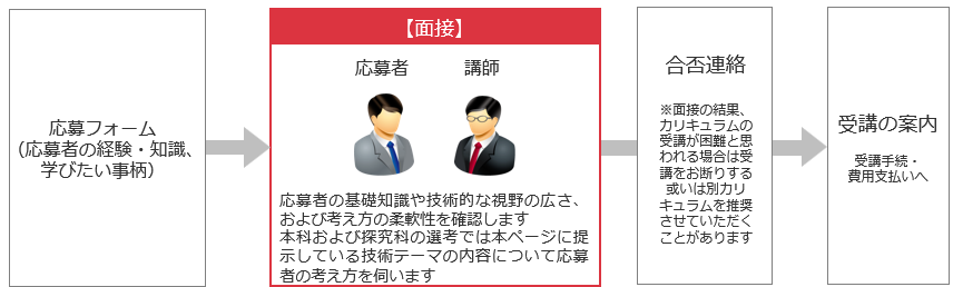 面接後に、応募者に合否の連絡を行います。カリキュラム受講が困難と思われる場合は受講をお断りする、或いは別カリキュラムを推奨させていただくことがあります。合格した方は期日までに受講手続きおよび受講費用の支払いを完了してください。