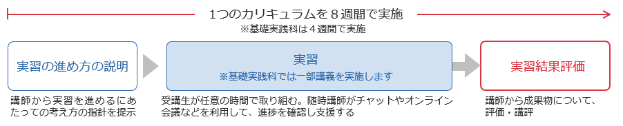 受講生は基本的に任意の時間で課題に取り組みます。適宜、講師がチャットやオンライン会議などを利用して実習の進捗確認および受講生の質問に答える時間を設け、フォローを実施します。講師とのコミュニケーションは原則、当社営業日(※)にチャットやオンライン会議等で実施します。受講生が希望する場合は、スケジュール調整のうえ教室(飯田橋グラン・ブルーム内)で対面指導を受けることも可能です。
