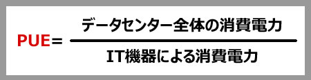 PUEは、IT機器以外の各種設備の消費電力をどれくらい低減できているかを表し、IT機器にかかる消費電力のみであれば1となる指標で、冷却のための空調の電力が膨らむほど、数字が大きくなります。