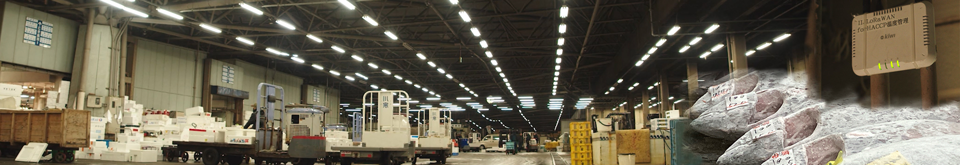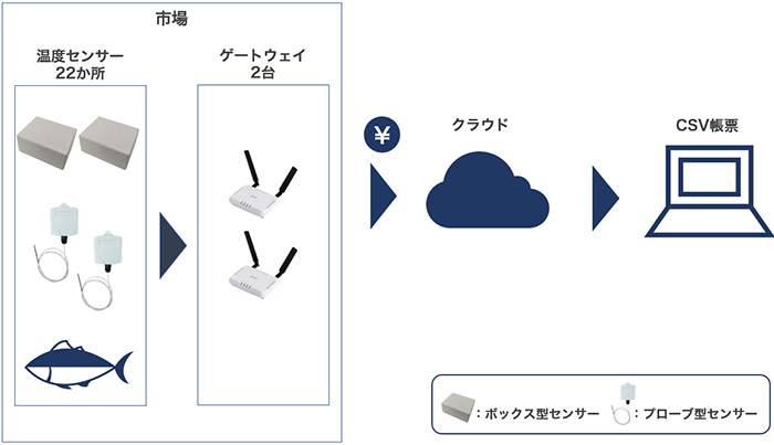 複数の温度センサーからの計測情報をいったん市場内に設置した中継機器(ゲートウェイ)へ集約させるのですが、船橋市場へ実際に出向き、設置に関する技術確認をIIJエンジニアが行ったところ、温度センサー22台に対してゲートウェイ機器はわずか2台の構成で済むことがわかりました。