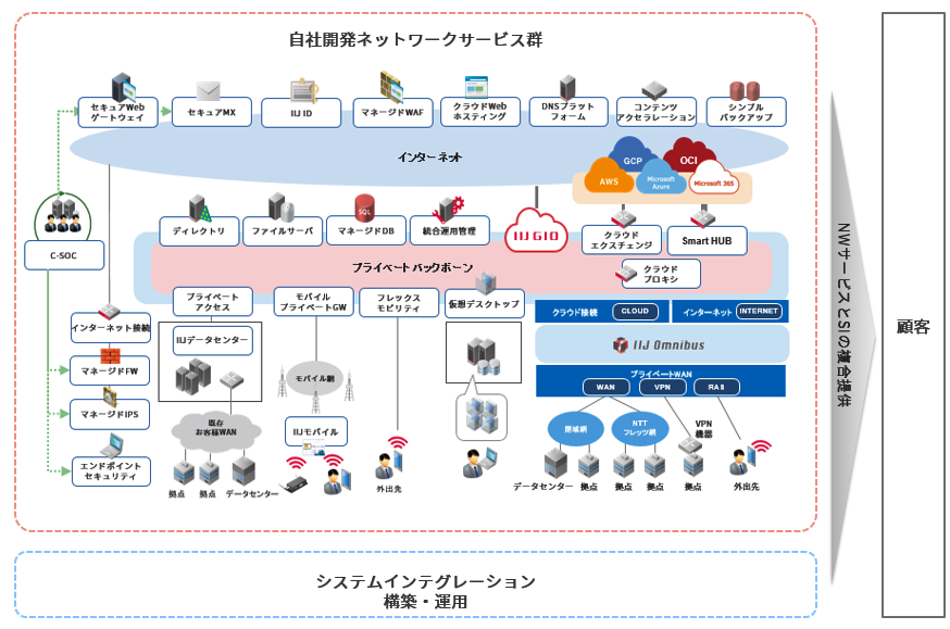 大規模な社内システムを運営するお客様へのインターネット関連サービスの提供は、社内システム外側部分でのインターネット接続やゲートウェイ型サービス等が従前の主軸でした。近年、大規模な企業・官公庁のシステムは、クラウド利用進展やリモートアクセス等のインターネット技術の複合利用に加え、高度なセキュリティ機能を具備するゼロトラストを前提としたものへと進化しております。これらにより、当社グループのネットワークサービス群・システムインテグレーションへの需要はますます高まるものと展望しております。