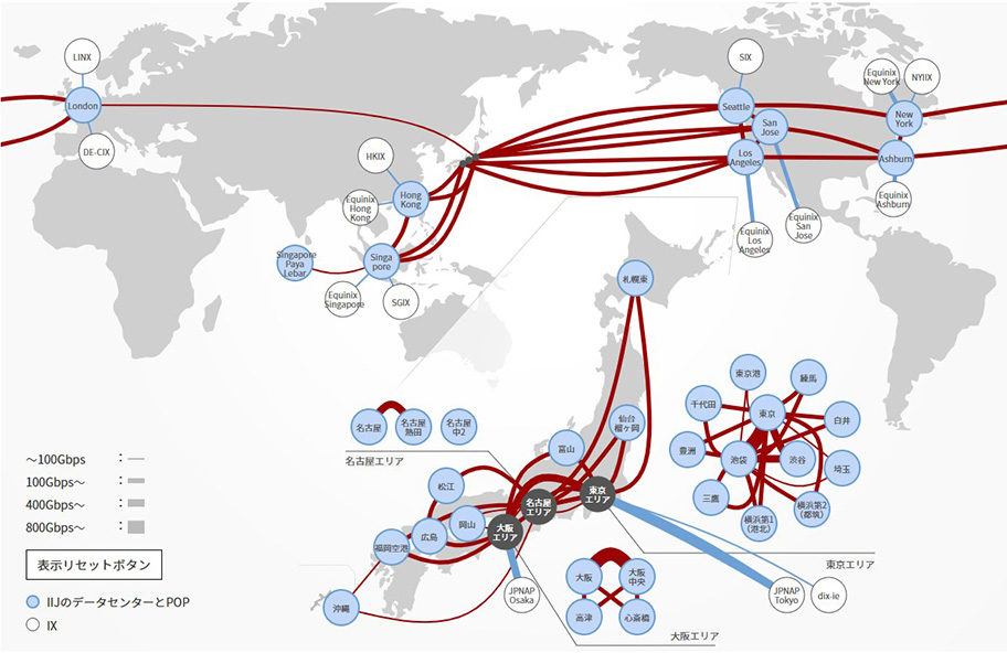 当社が自社運営するインターネット・バックボーンネットワーク(以下、「バックボーン」という。)は国内最大級であり、米国・欧州・アジアへと延伸し、現地法人にてこれらを自社運営することで、グローバルで高品質なインターネット環境を提供しております。インターネットトラフィックの増加にあわせて恒常的にネットワークを随時増強しております。