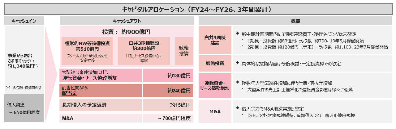 - (ⅴ)案件大口化等に伴い、特にシステムインテグレーション分野の事業・プロジェクト管理手法の高度化を実現します。大型のデータセンター向け設備投資及び運転資金の増加等に対応し、適切なキャピタルアロケーション及びバランスシートのマネジメントを遂行します。
