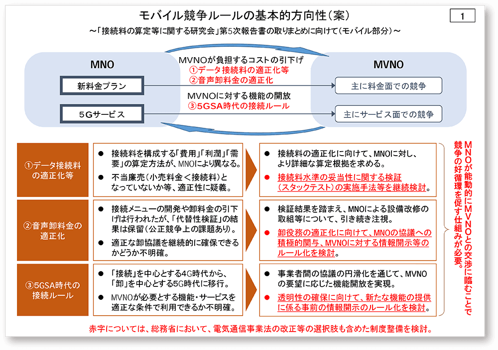 第2の柱は、MNOやMVNOといった事業者間の競争が活性化するよう、MVNOにサービスを卸しているMNOが卸料金を低廉化し、公正な競争を促進するものです。