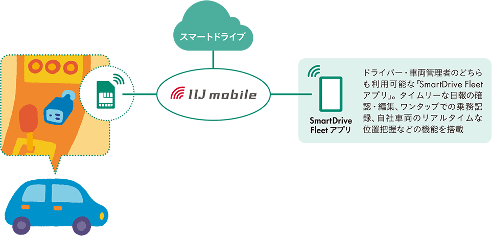 LTE通信型ドライブレコーダー「SmartDrive Fleetドライブレコーダー」にIIJモバイルタイプIのチップ型SIMが採用されている。
