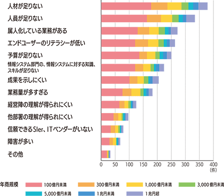 「人材」や「人員」など、ヒューマンリソースに関する課題が上位を占める一方、「その他」の回答には、「次世代を担う人材がいない」や「経営陣がITに関心がない」などがあった。