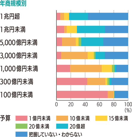 年商規模があがるほど予算が増えるが、「把握していない・わからない」という回答も増える。