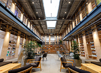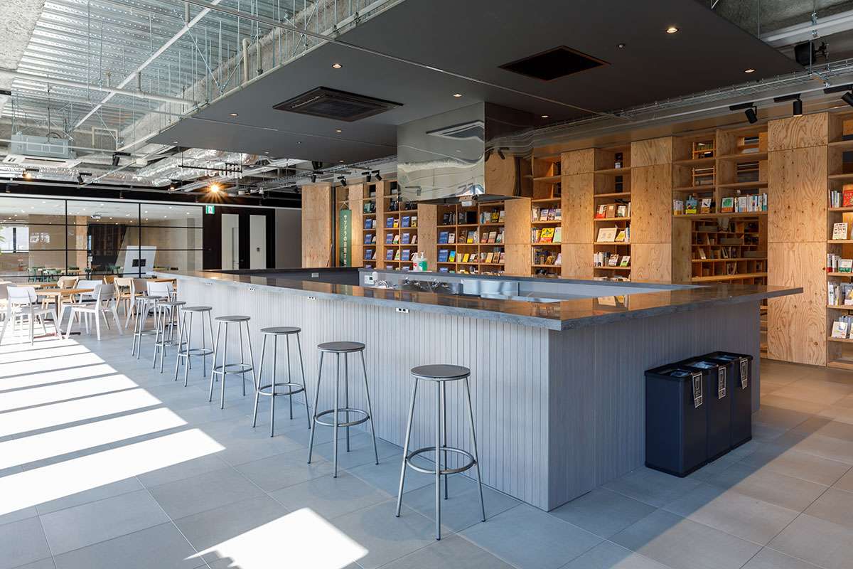 2Fには厳選された約3500冊が並ぶ図書館「BOOK LOUNGE」があり、誰でも自由に本を手に取ることができます。同じ階には、関連会社やベンチャー企業の社員が働くシェアオフィスと、社内外の人々の交流を促すカフェスペース「HUB SPACE」があります。多様な立場の人が混然一体となって過ごすことで、学びや気づき、イノベーションの促進が期待されます。今はコロナ禍の影響でオンライン開催が主体ですが、地域経済振興やDXなどに関するイベントも週に一回ほど実施されており、社内外の人でにぎわっています。